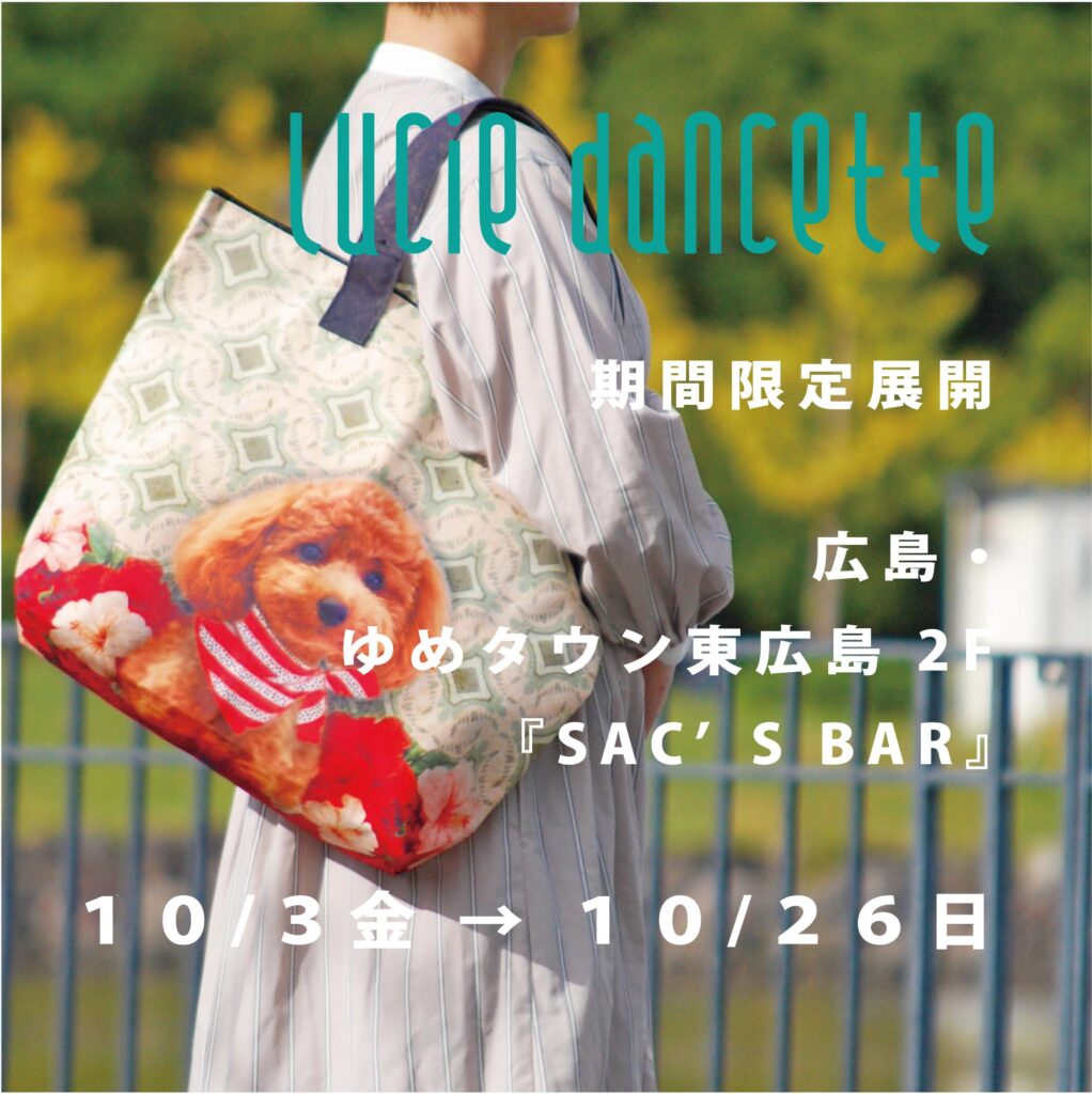 【POP UP SHOP】2025.10.3→10.26 広島・ゆめタウン東広島 2F 『SAC’S BAR』:LUCIE DANCETTE 2025年12月4日 Events 広島県中央部に位置する、国際学術研究都市、東広島市の、ゆめタウン東広島店 2F『SAC’S BAR (サックスバー)』での期間限定展開がはじまります。 10/3 金 → 10/26 日広島・ゆめタウン東広島 2F 『SAC’S BAR』 #広島 #東広島 #西条 #ゆめタウン タグ:laissezluciefaire, luciedancette, sacsbar, リュシーダンセット 投稿ナビゲーション 前 前の投稿: 【POP UP SHOP】2025.10.3→10.26 熊本・ゆめタウン光の森 1F 『SAC’S BAR ANOTHER LOUNGE』:LUCIE DANCETTE次 次の投稿: 【POP UP SHOP】2025.10.20 → 11.30 東京・アトレ亀戸 5F 『有隣堂書店 亀戸店』:LUCIE DANCETTE