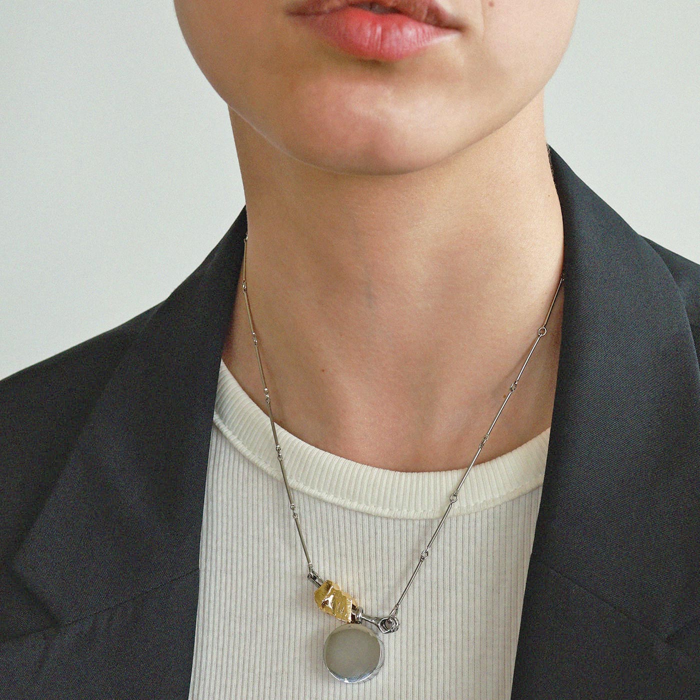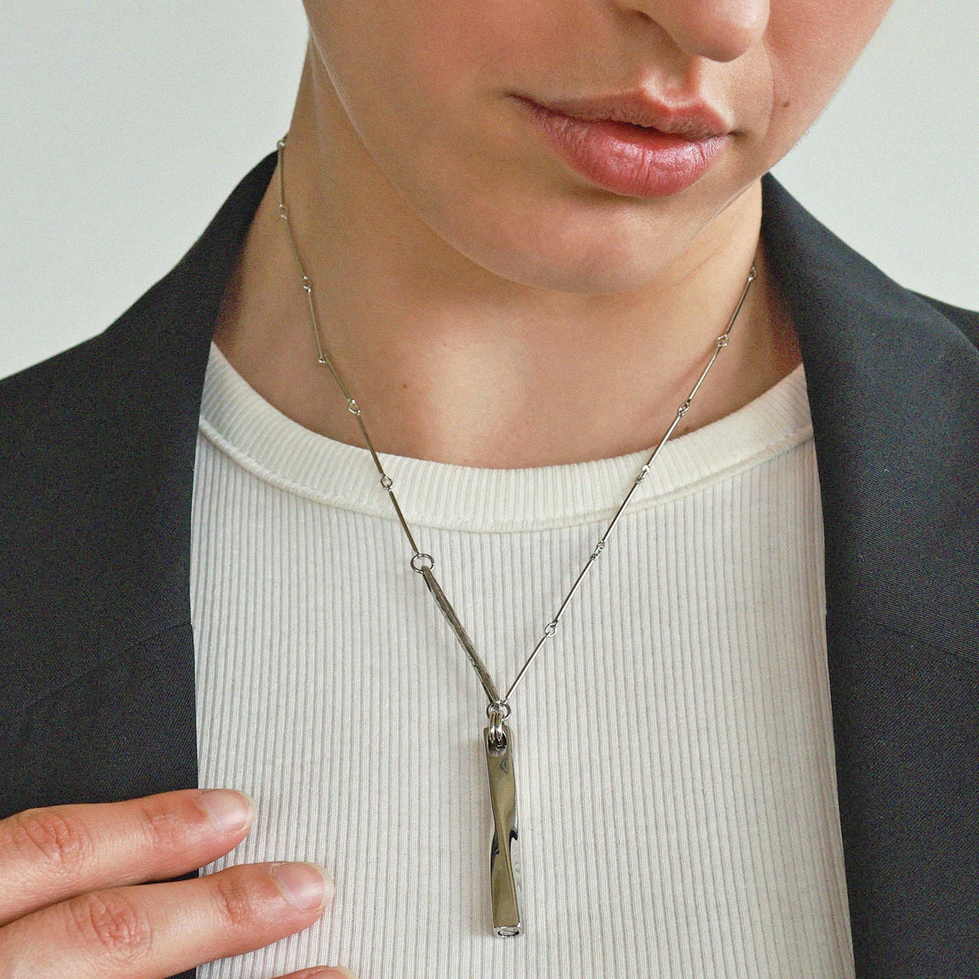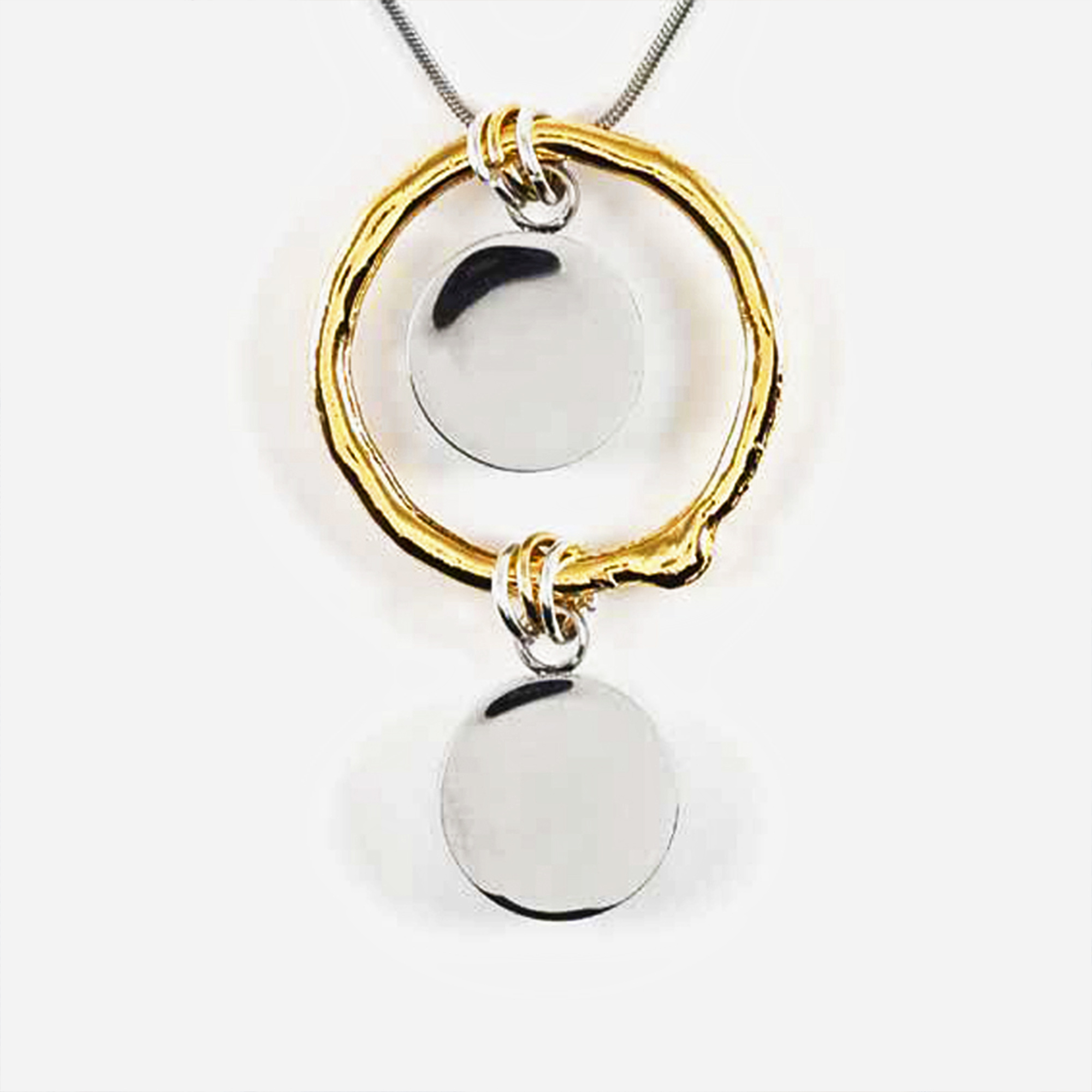 素材:Stainless steel, Pewter ステンレススティール、ピューター メッキ:22金 止め金具:マンテル Tag bar 長さ:51 – 65 cm 色:Two-tone/シルバー+ゴールド