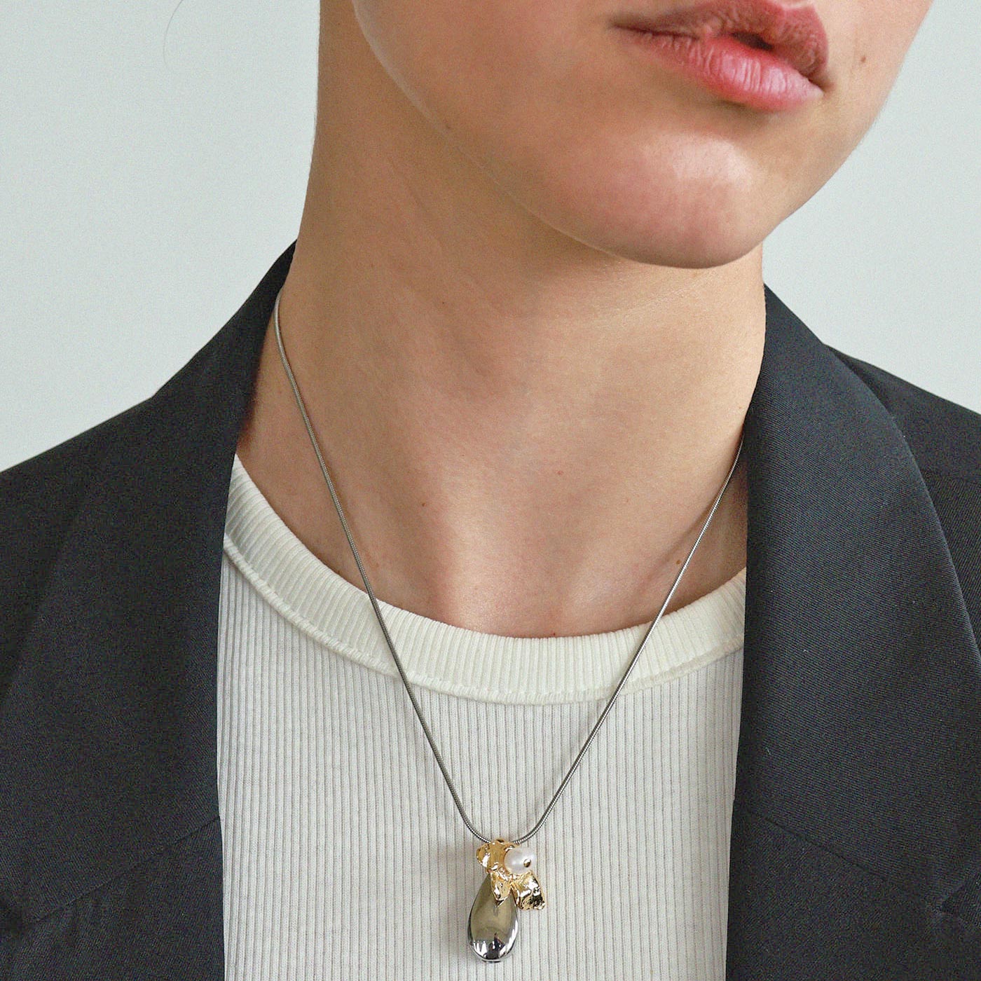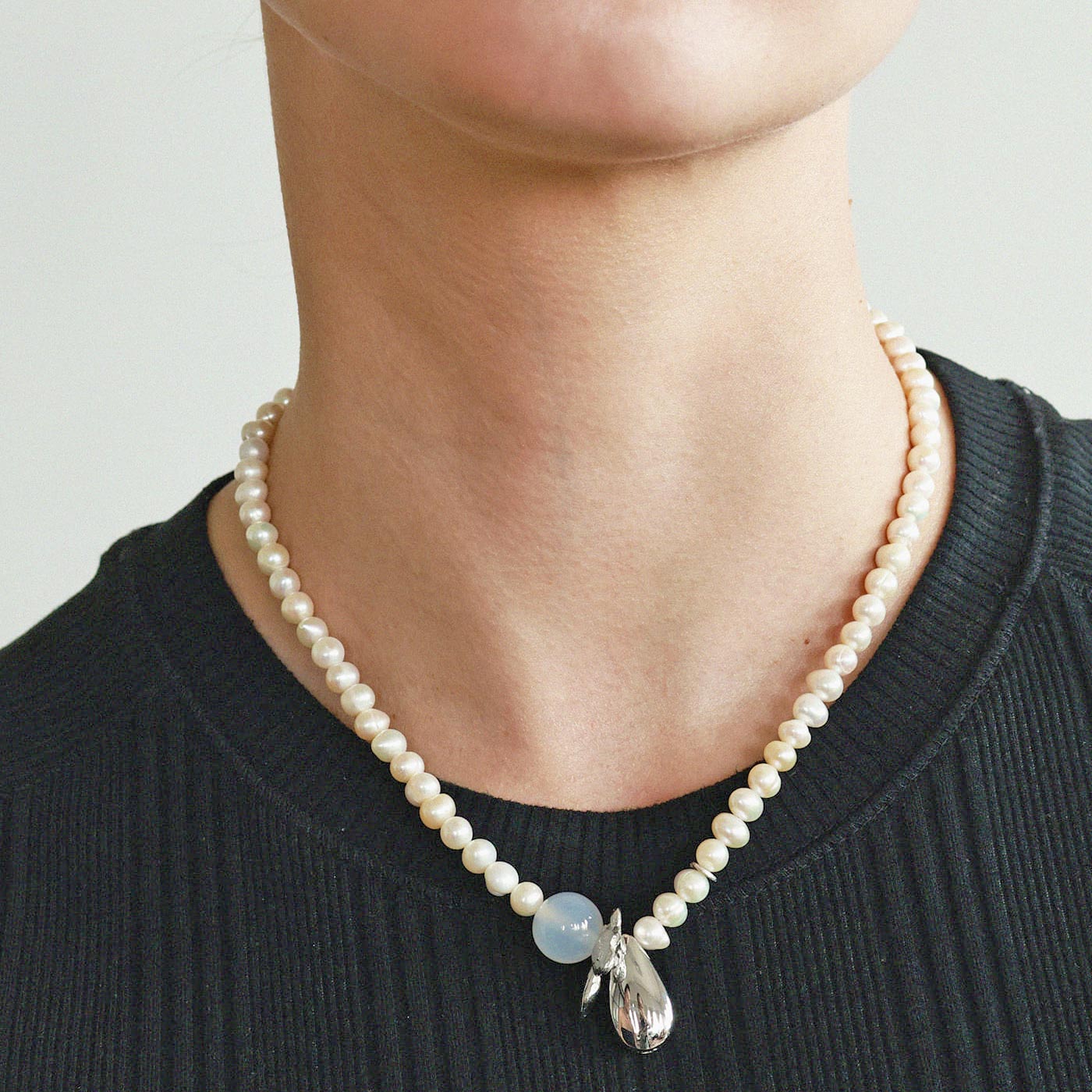 素材:Pearl, Stainless steel, Pewter, Agate 淡水パール、ステンレススティール、ピューター、アゲート(瑪瑙) メッキ:22金 止め金具:マンテル Tag bar 長さ:40 ̵…