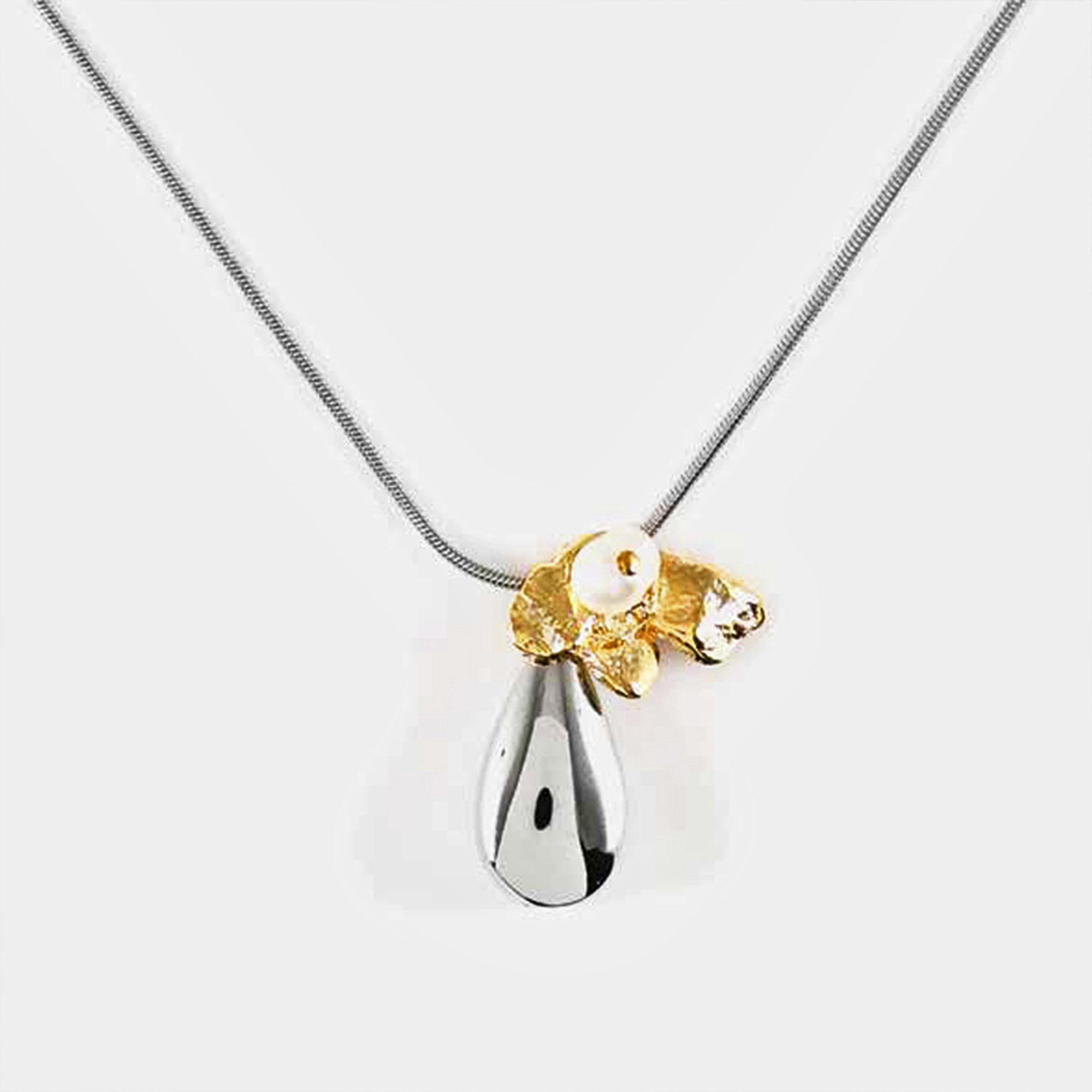 スペシャルコレクション「MEMENTO | メメント」の1つ。シンプルなチェーンのトップに、ステンレススティールとピューターパーツとを掛けた普遍性あるデザイン。