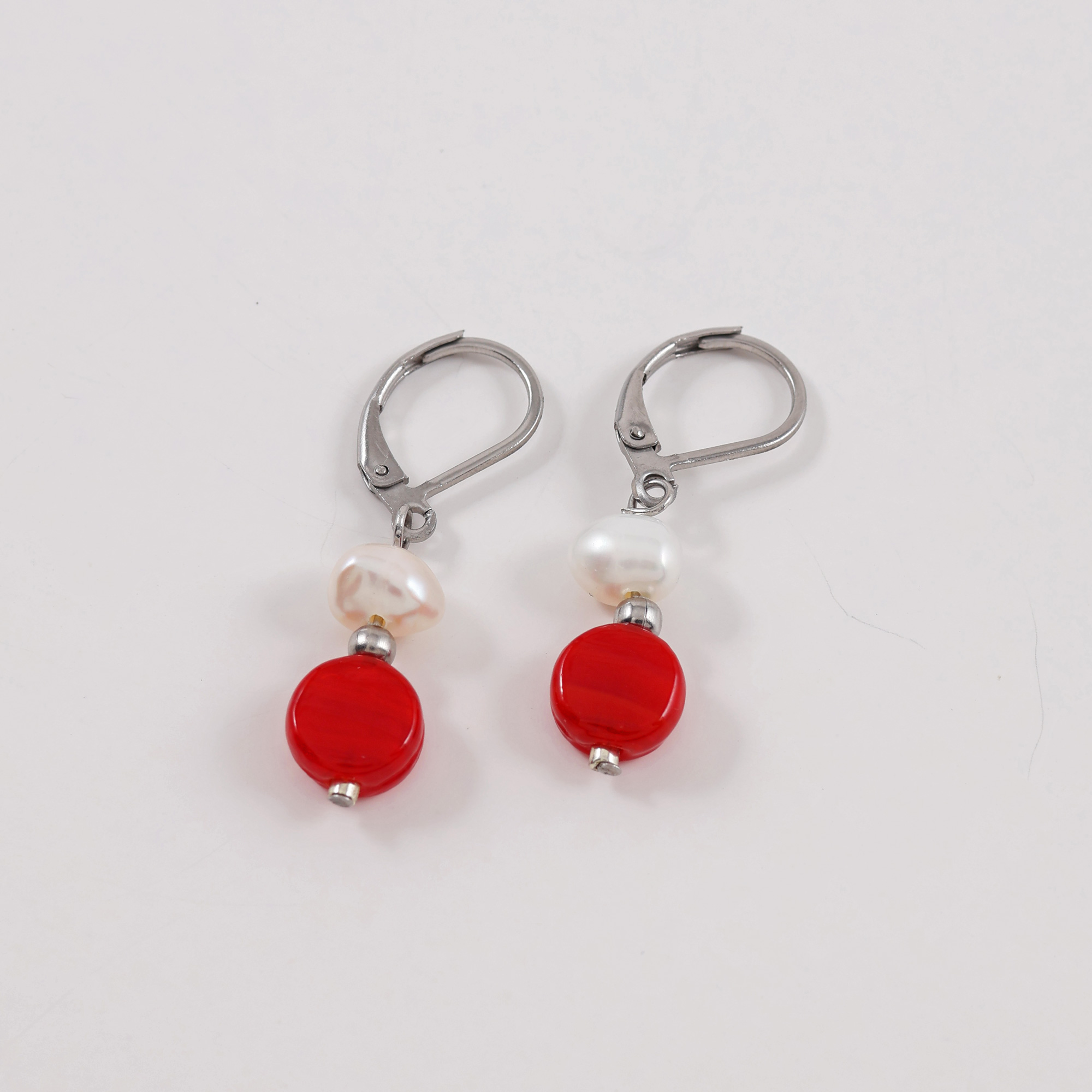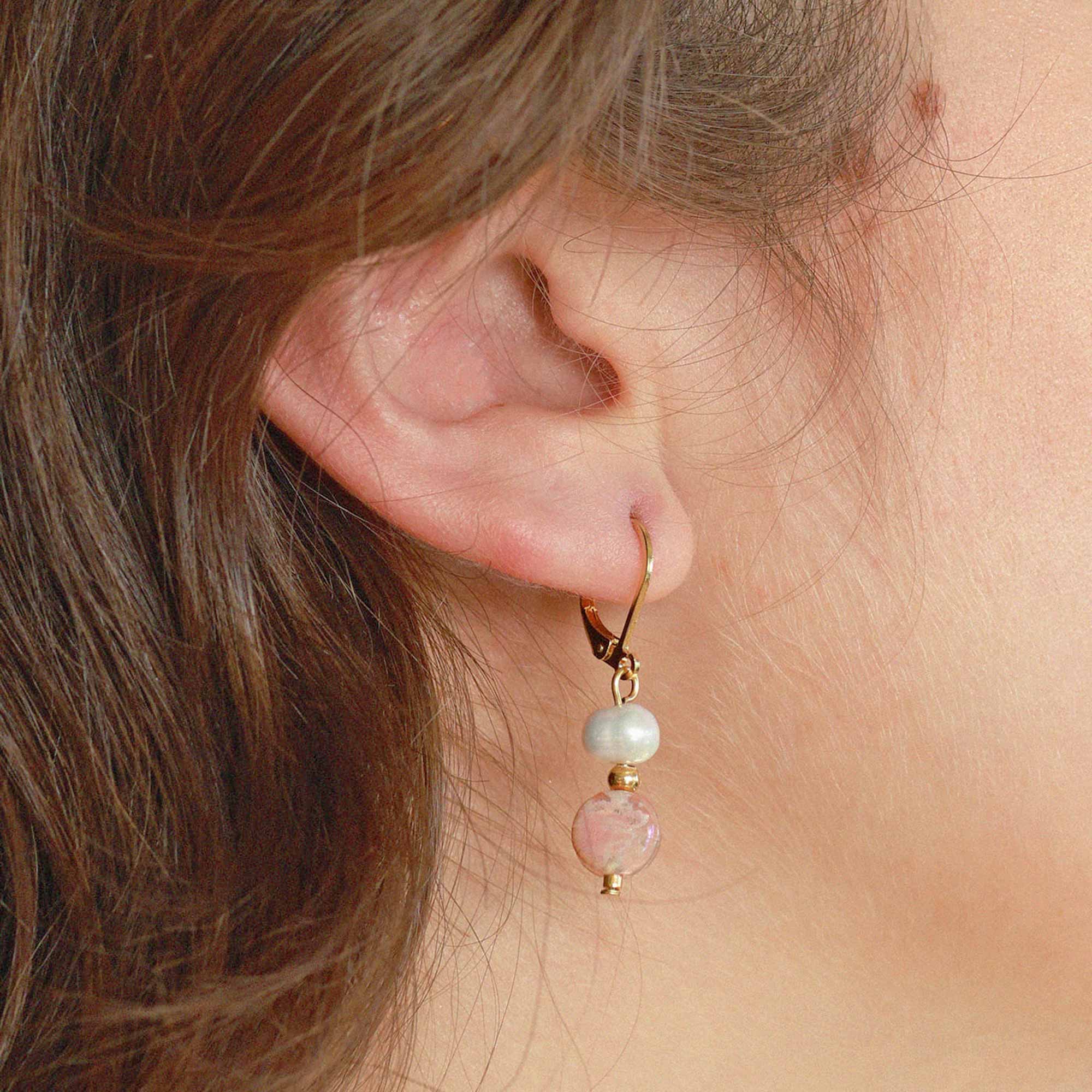淡水パールと扁平型のガラスを組み合わせた、華奢なイヤリングピアス。