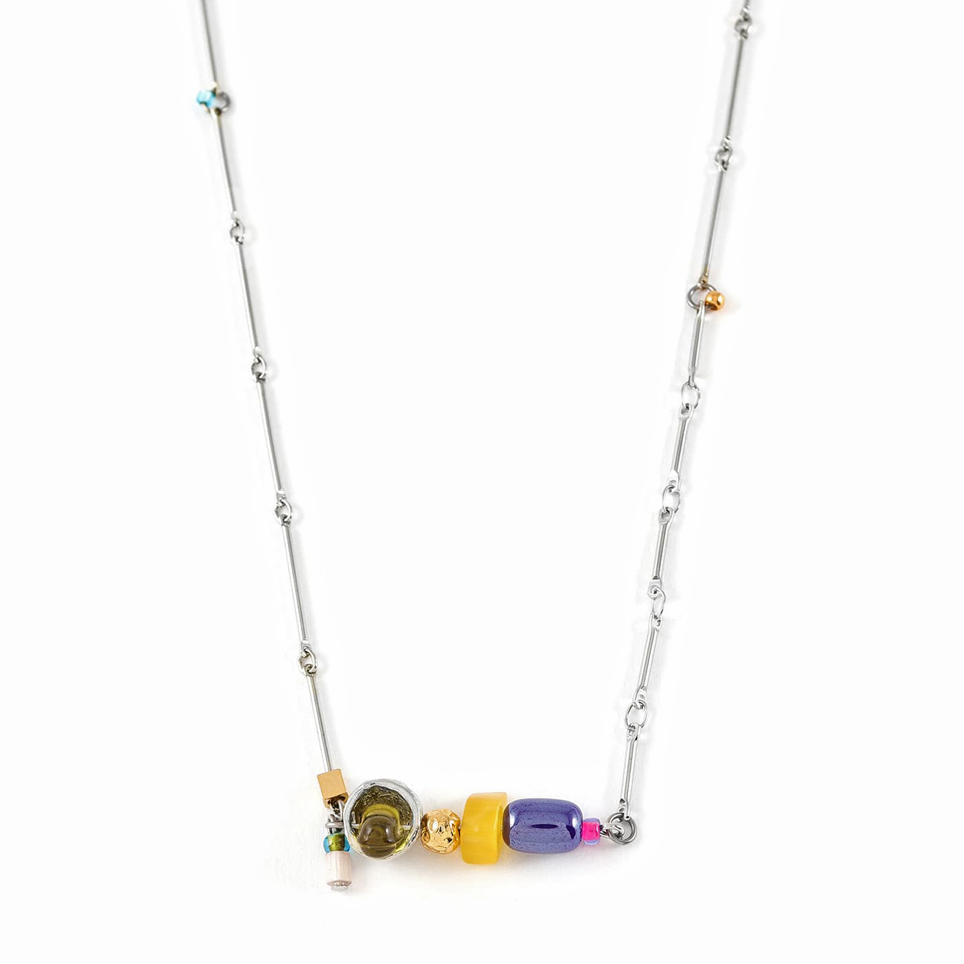 ガラス、半貴石(アゲート、クォーツ)にはさまれた極小の球体は、ステンレススティール。小さめデザインながら、横に並べられたさまざまな色・形が目を引き付けるネックレス。長さは、少し長め。