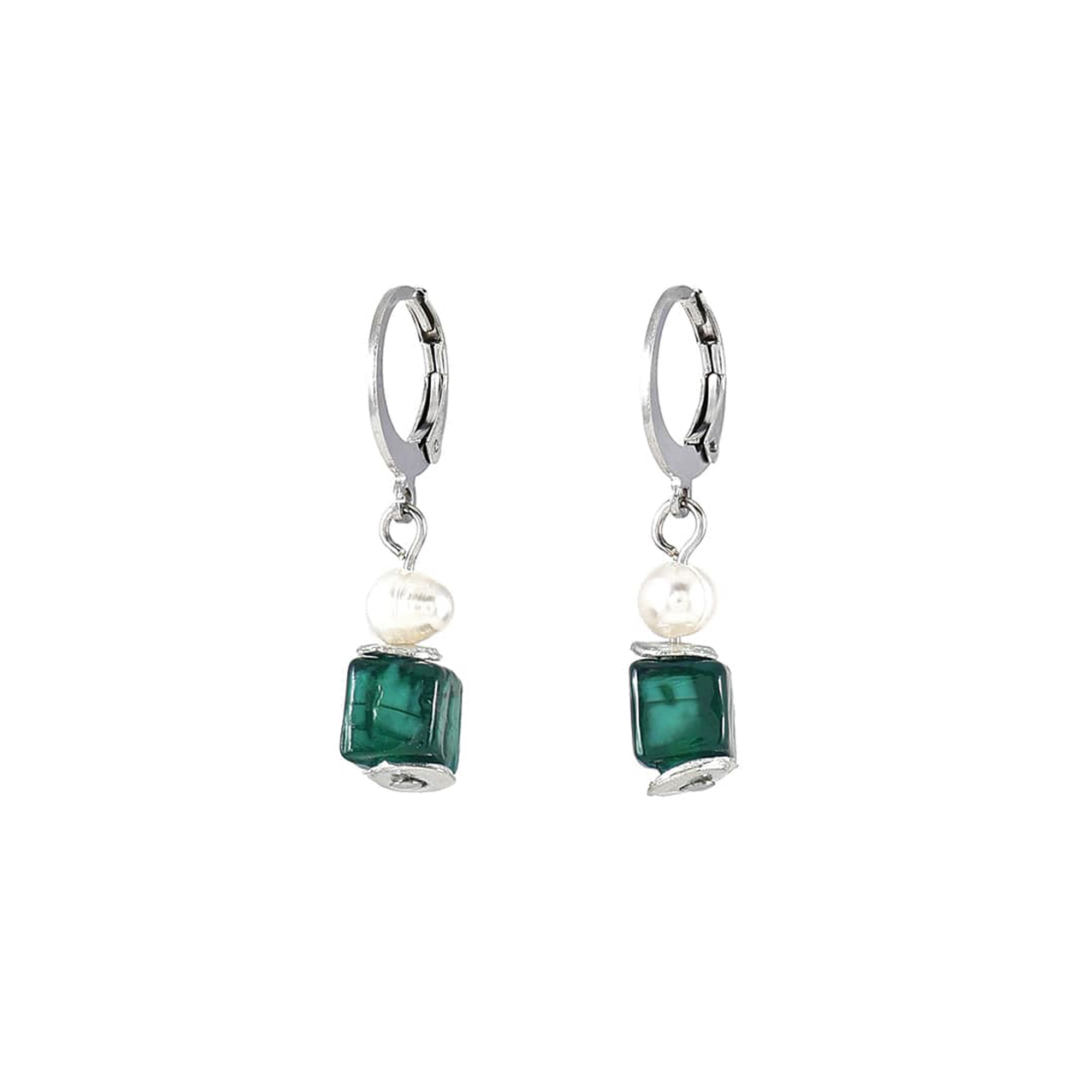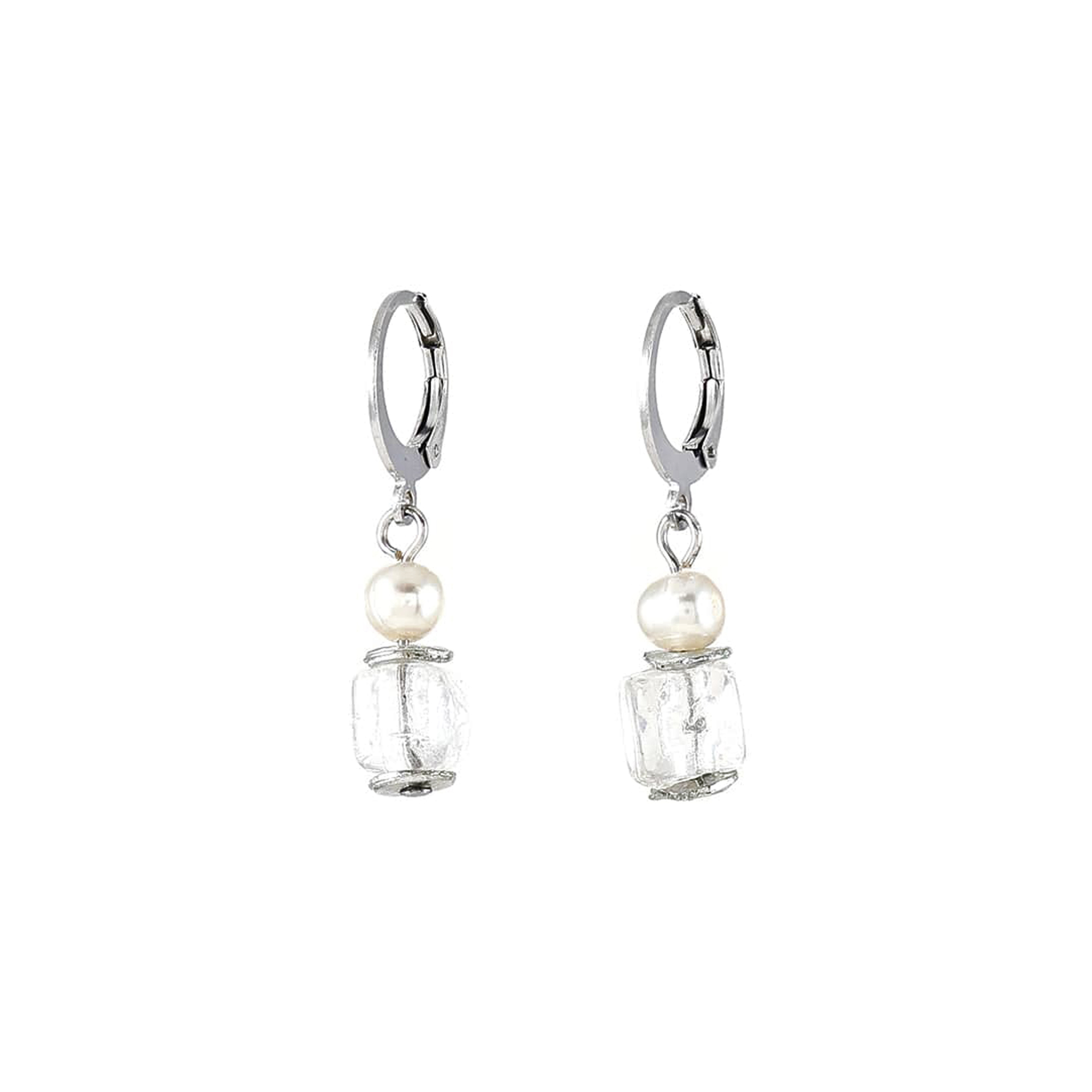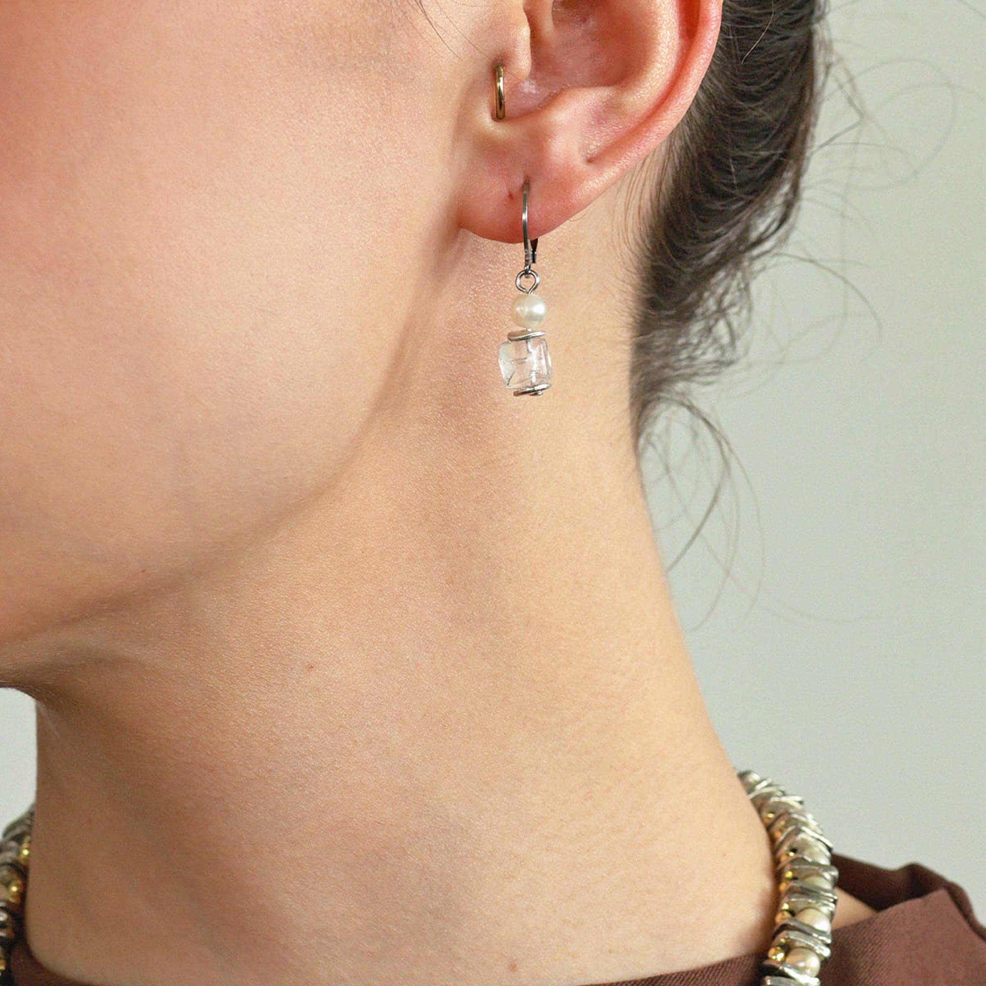 淡水パールとキューブ型のガラスを組み合わせたイヤリングピアス。ガラスパーツを上下に挟むピューターパーツが、アートなイメージを加えます。