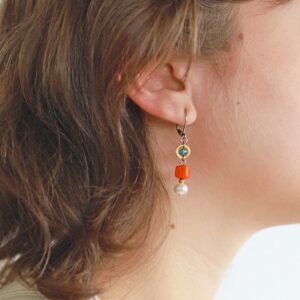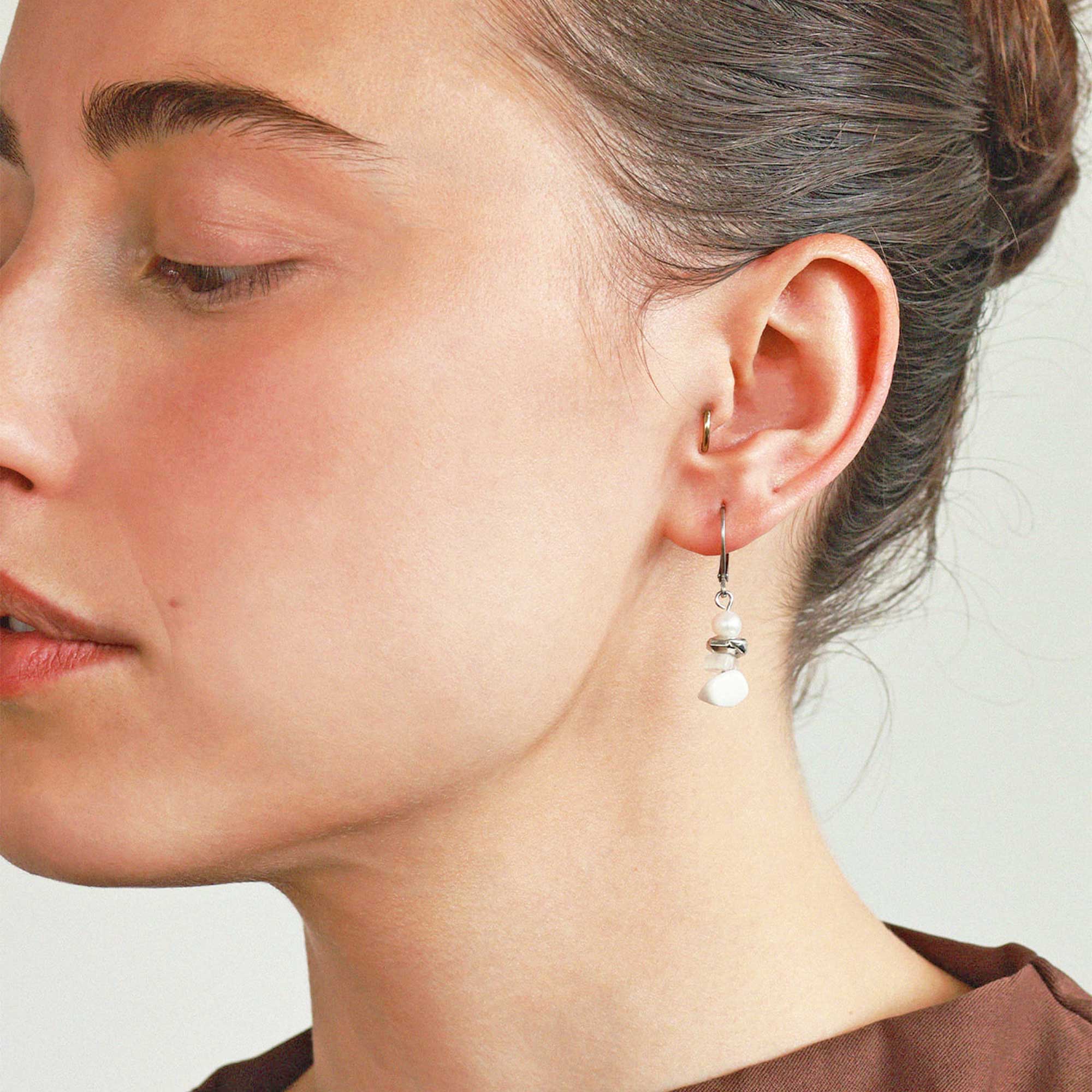 アンマリーにはめずらしく、このイヤリングピアスではアゲート(メノウ)とジャスパー(碧玉)を組み合わせています。自然な形のままの天然石も、アンマリーがデザインすると、無機的な雰囲気もまといます。