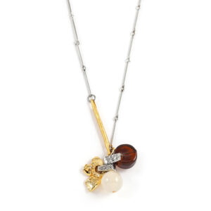 ピューター、2つのガラス、淡水パールを縦に長く並べ、アシンメトリーなチェーンに下げた、使いやすいデザインのネックレス。