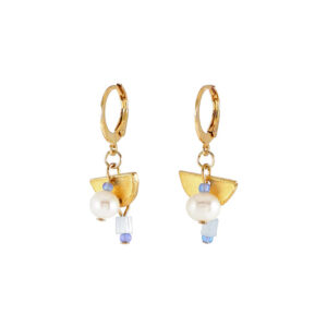 ぎこちないバランスでつなげられたガラスとステンレススティールが個性的な、イヤリングピアス。