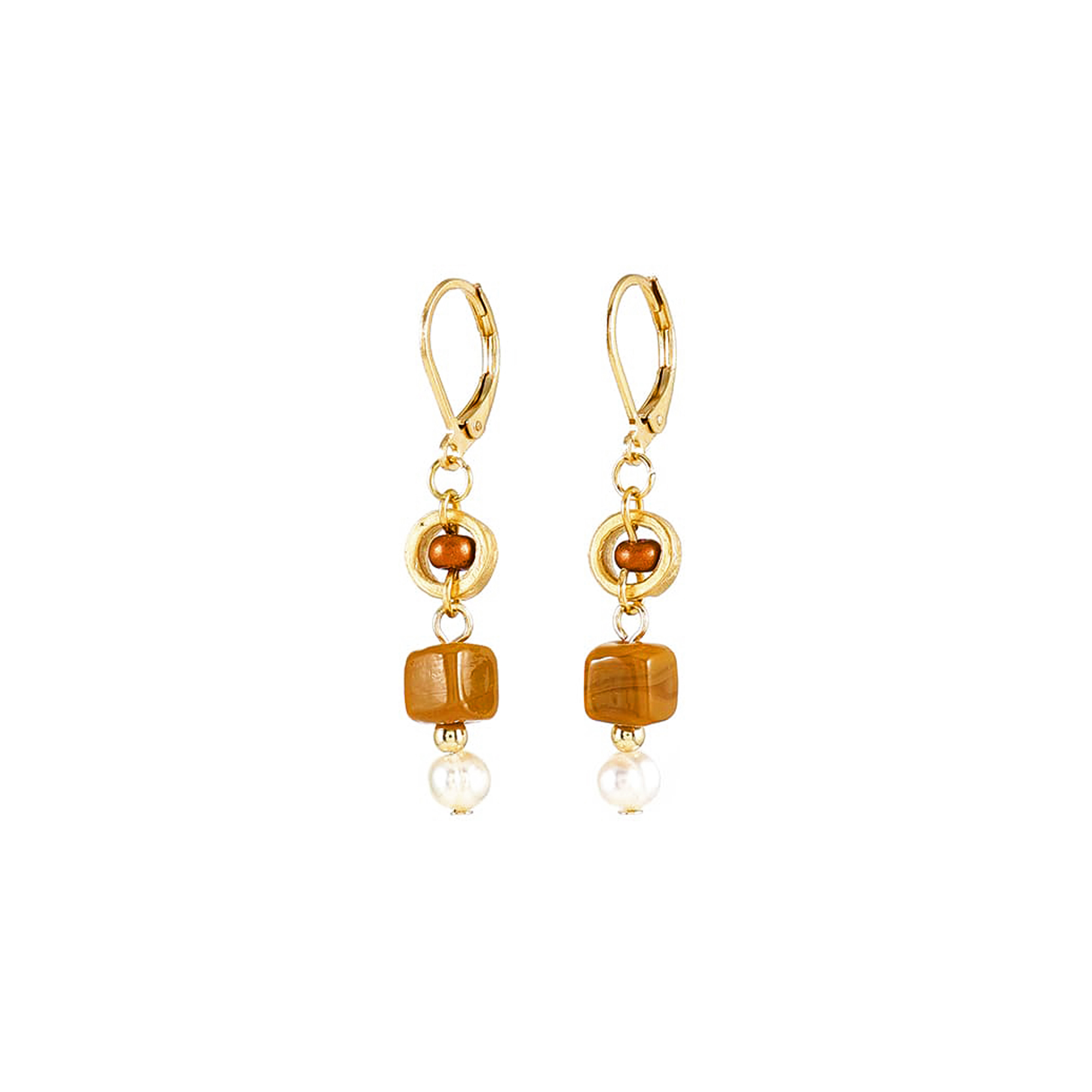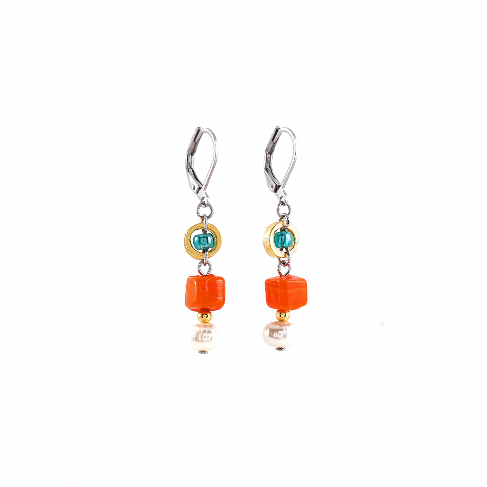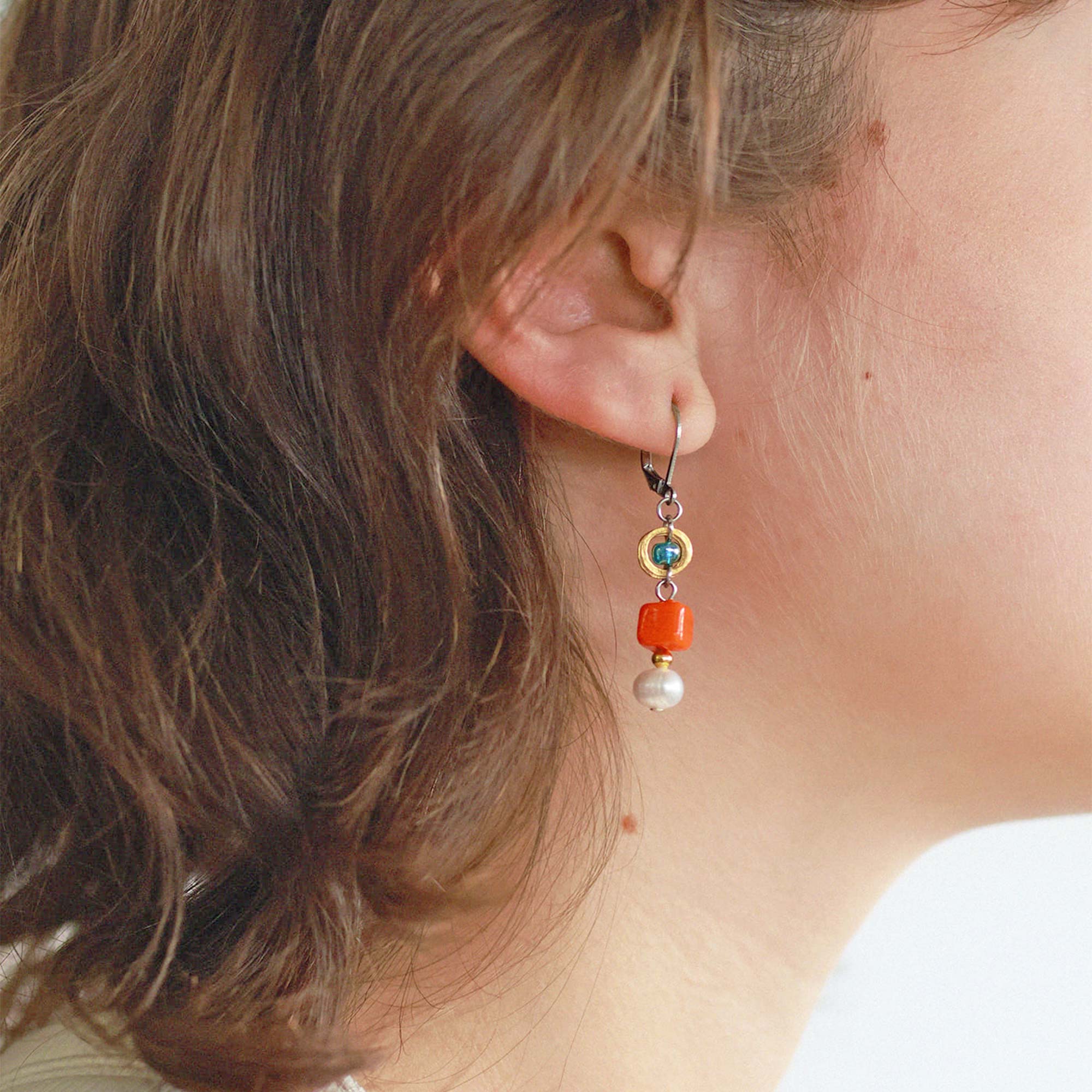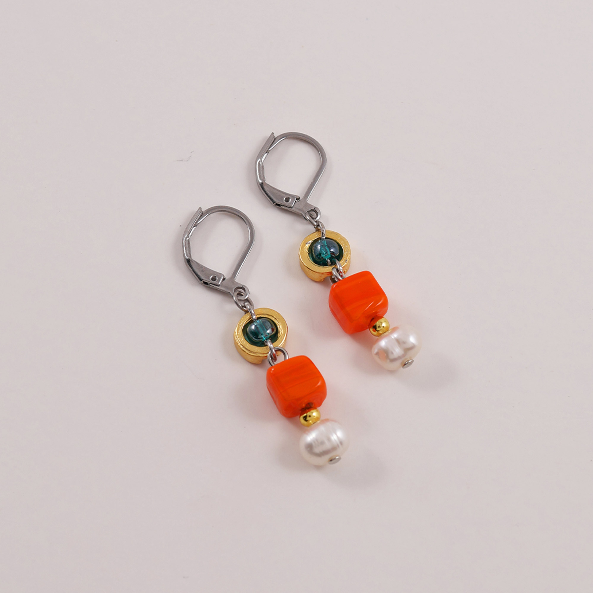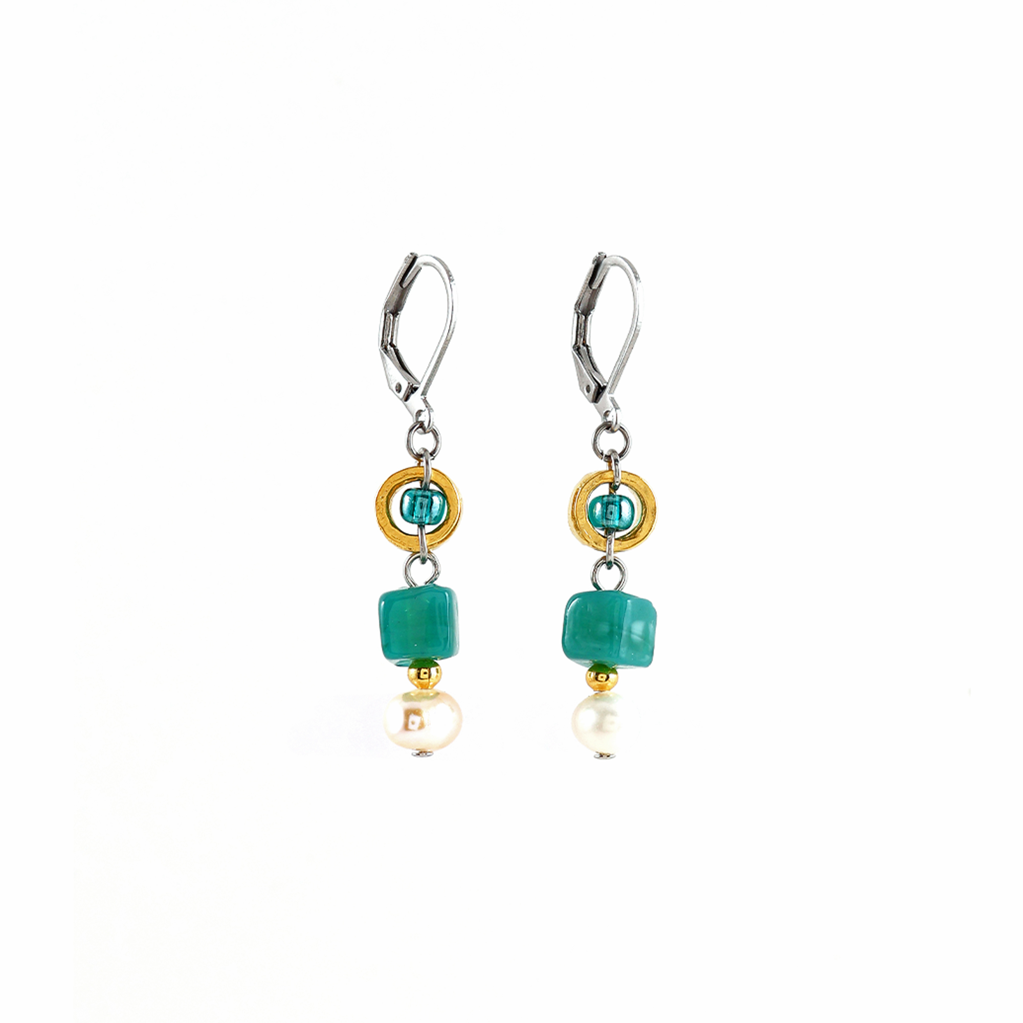 ガラス、淡水パール、ピューターを組み合わせた、やわらかさと硬質さをあわせ持つデザインのイヤリングピアス。