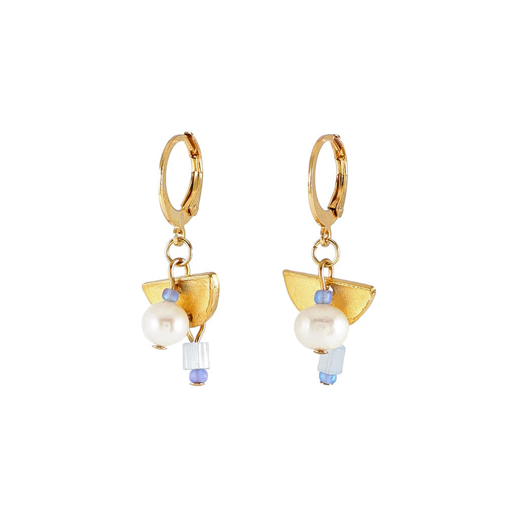少し大きめの淡水パールと、ガラス、三日月形のピューターメタルを組み合わせた、かわいらしくも甘すぎないデザインのイヤリングピアス。