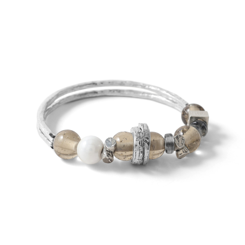 ガラスとピューターピースを数珠つなぎにした半面と、ピューターの大きな2連の弧と、2つのデザインが楽しめるブレスレット。