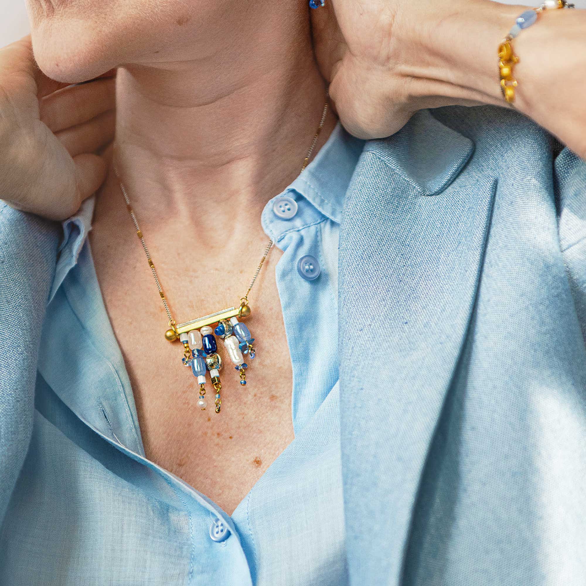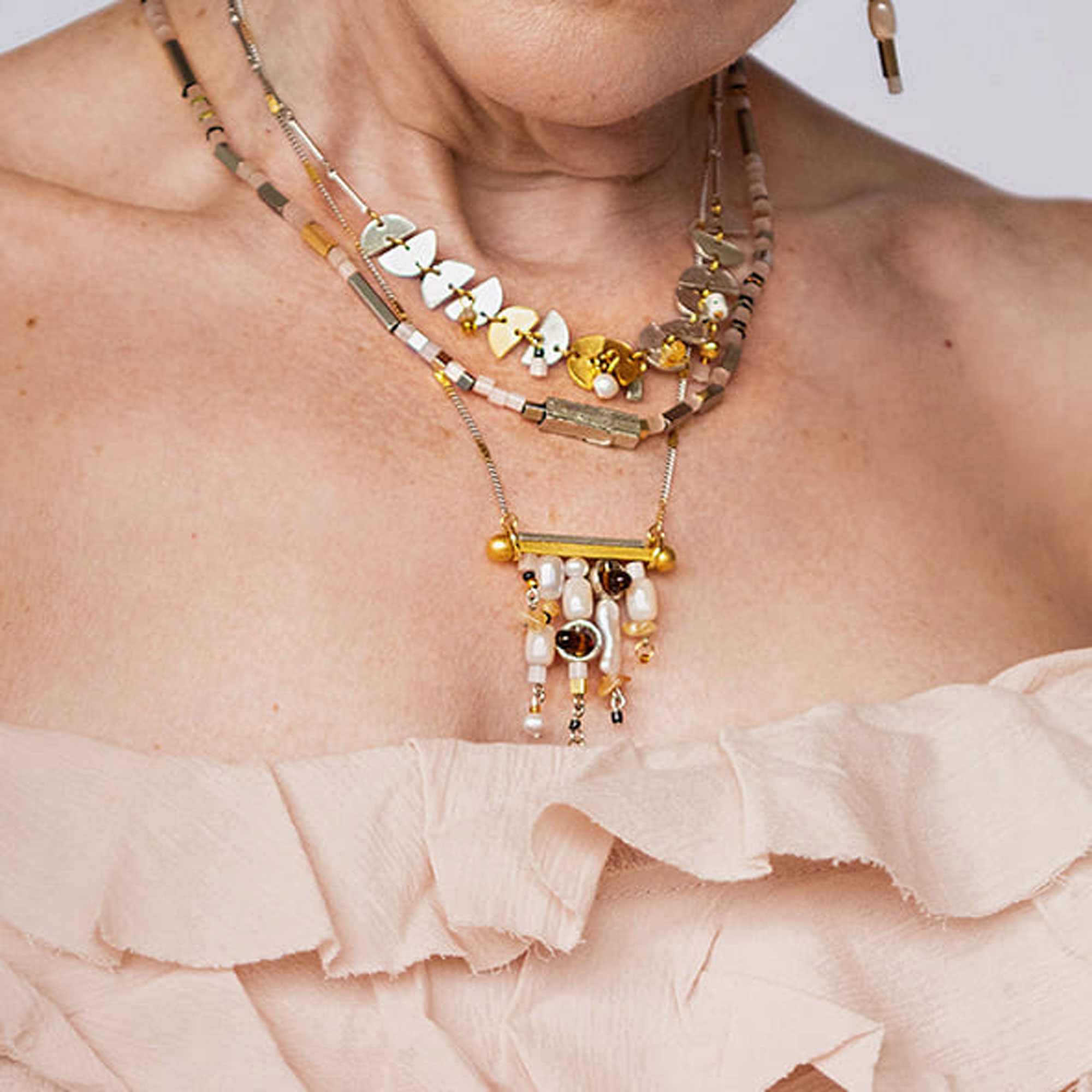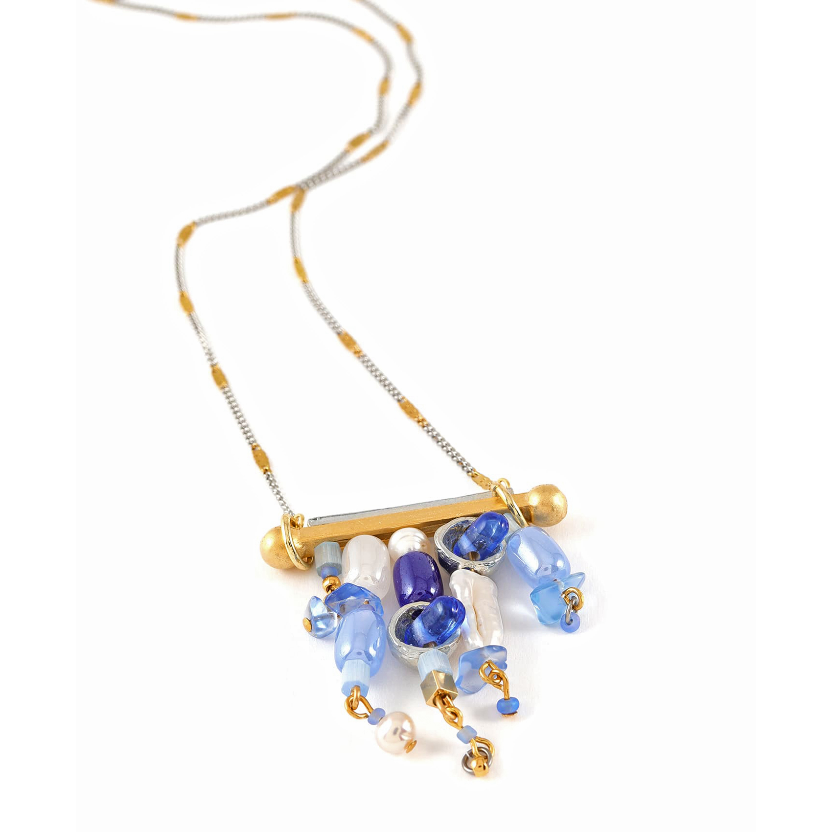 横向きのピューターメタルのバーに、ガラスや淡水バロックパール、半貴石がぶら下がった、ジャンルレスの個性的なネックレス。未来的でもあり、アンティーク的でもあり…