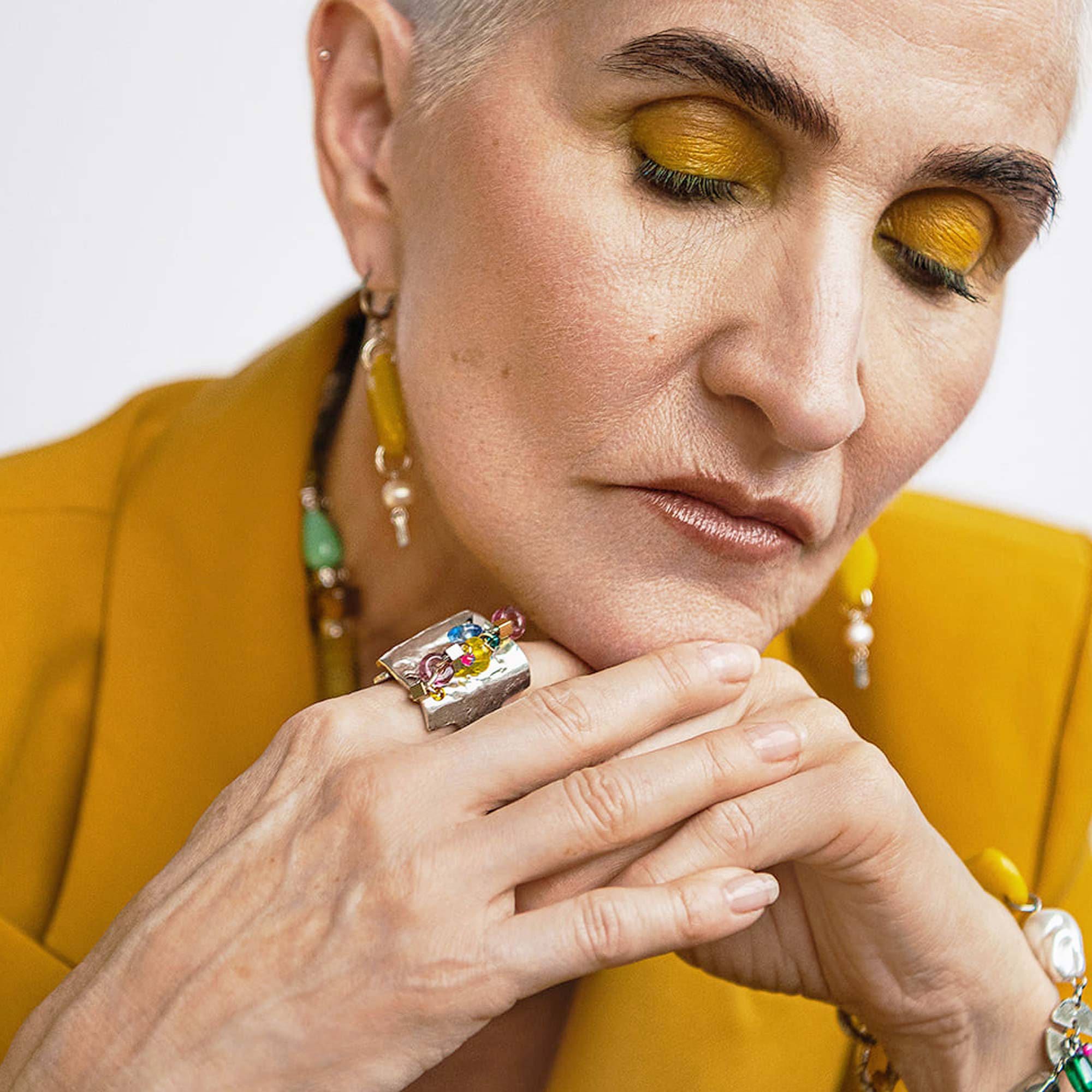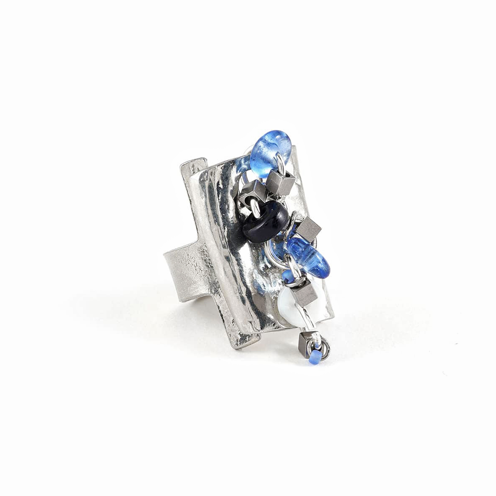 幅広の武骨なピューターのベースに、キャンディボックスのようにガラスとステンレススティールがちりばめられた、存在感あるリング。