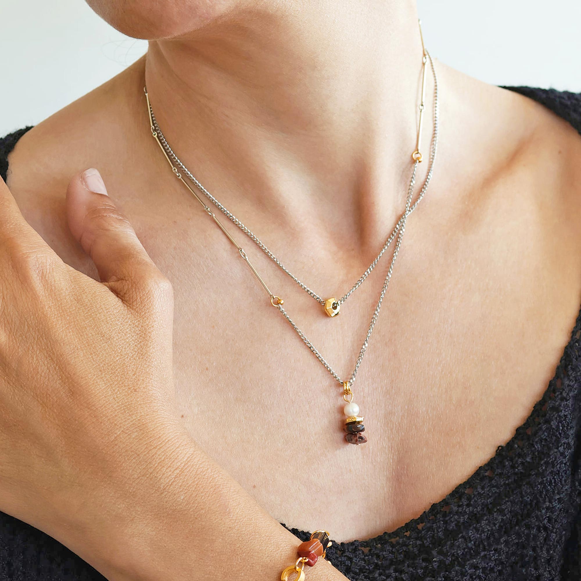 素材:Pewter, Agate, Jasper ピューター、アゲート(メノウ)、ジャスパー(碧玉) 長さ:41 – 43.5 cm 止め金具:ロブスタークラスプ Lobster crimp 色:FallBl…